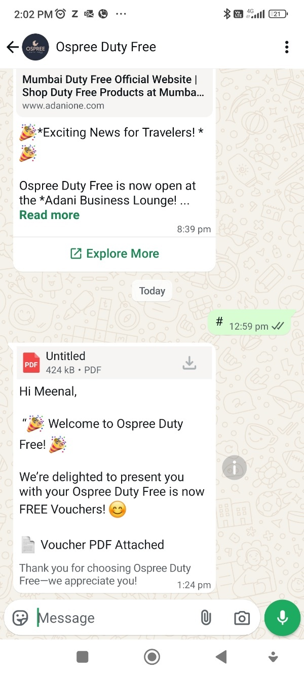 The DFIF voucher PDF is then sent to consumers whatsapp from Ospree Duty Free whatsapp